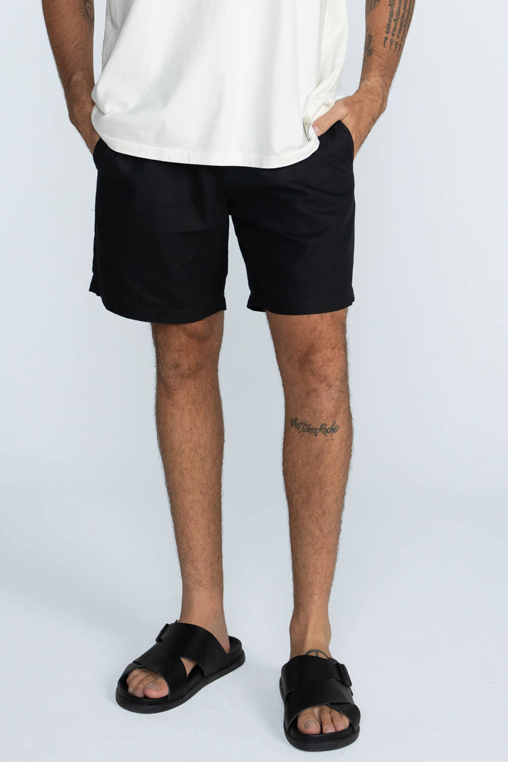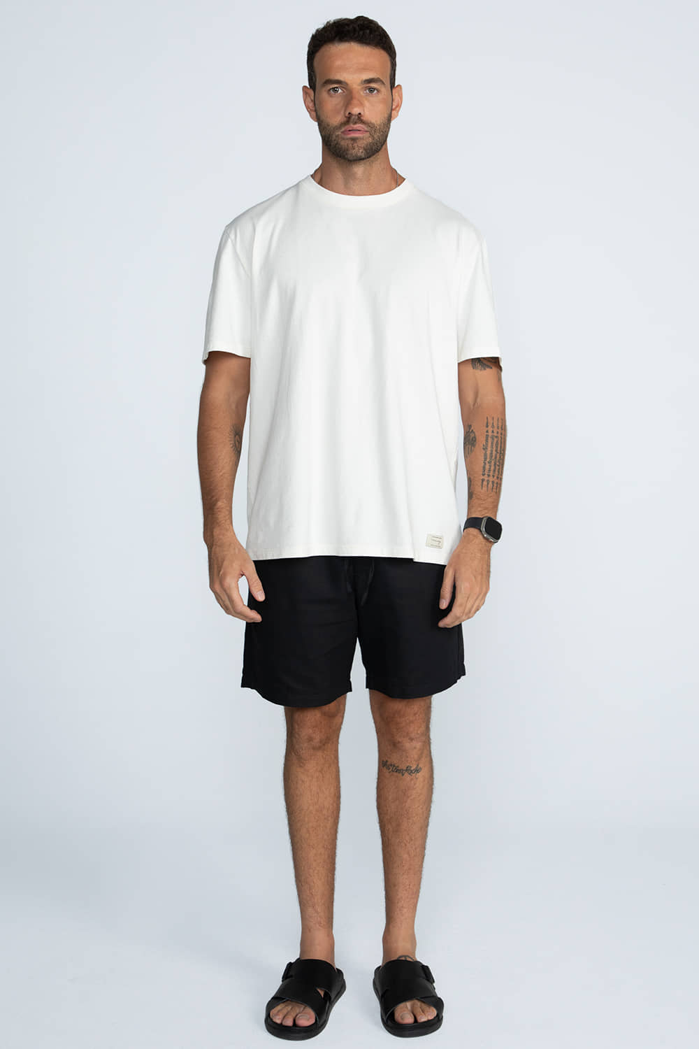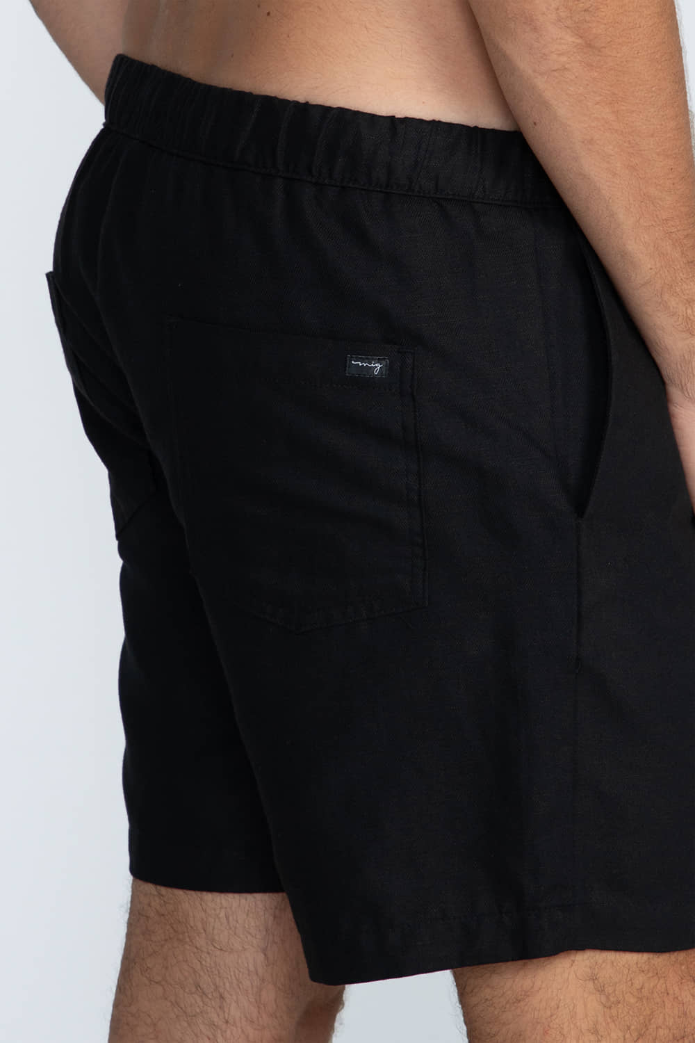 Bermuda de modelagem reta com cós e fechamento por zíper e colchete. Possui cadarço embutido para ajuste, bolsos faca laterais e dois bolsos traseiros aplicados.