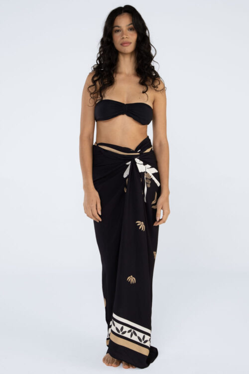 Top com modelagem tomara que caia, com cordões para amarração no centro da peça. Parte de baixo modelo tradicional.