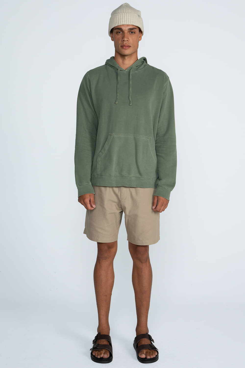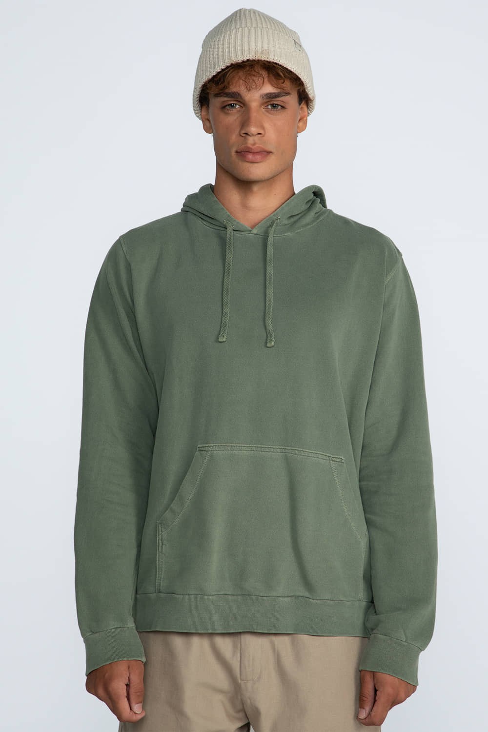 Blusão modelo canguru com modelagem tradicional. Possui bolso frontal amplo, capuz com cadarço embutido para ajuste, além de punhos e barra em ribana. O moletom proporciona conforto e leve aquecimento, enquanto a lavagem estonada garante um visual contemporâneo.