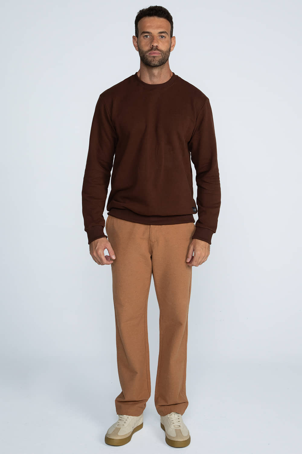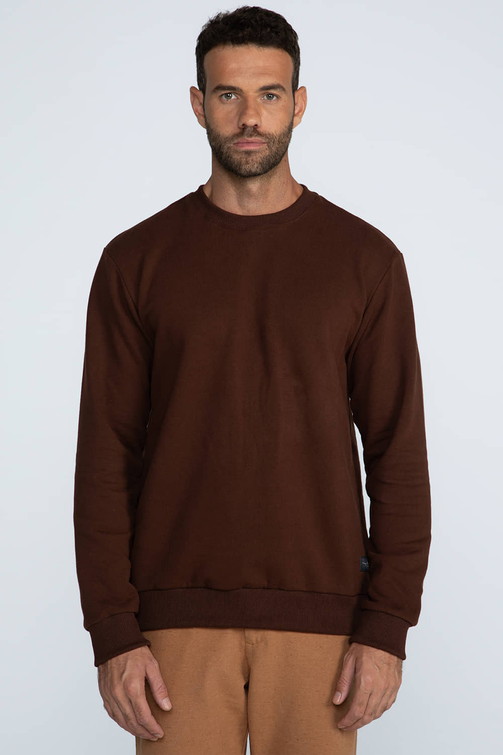 Blusão careca em moletom felpado e modelagem ampla. Possui gola redonda, punhos e barra em ribana. Conta com etiqueta externa frontal. O tecido apresenta acabamento peletizado externo, criando efeito aveludado, e felpa interna para maior aquecimento.