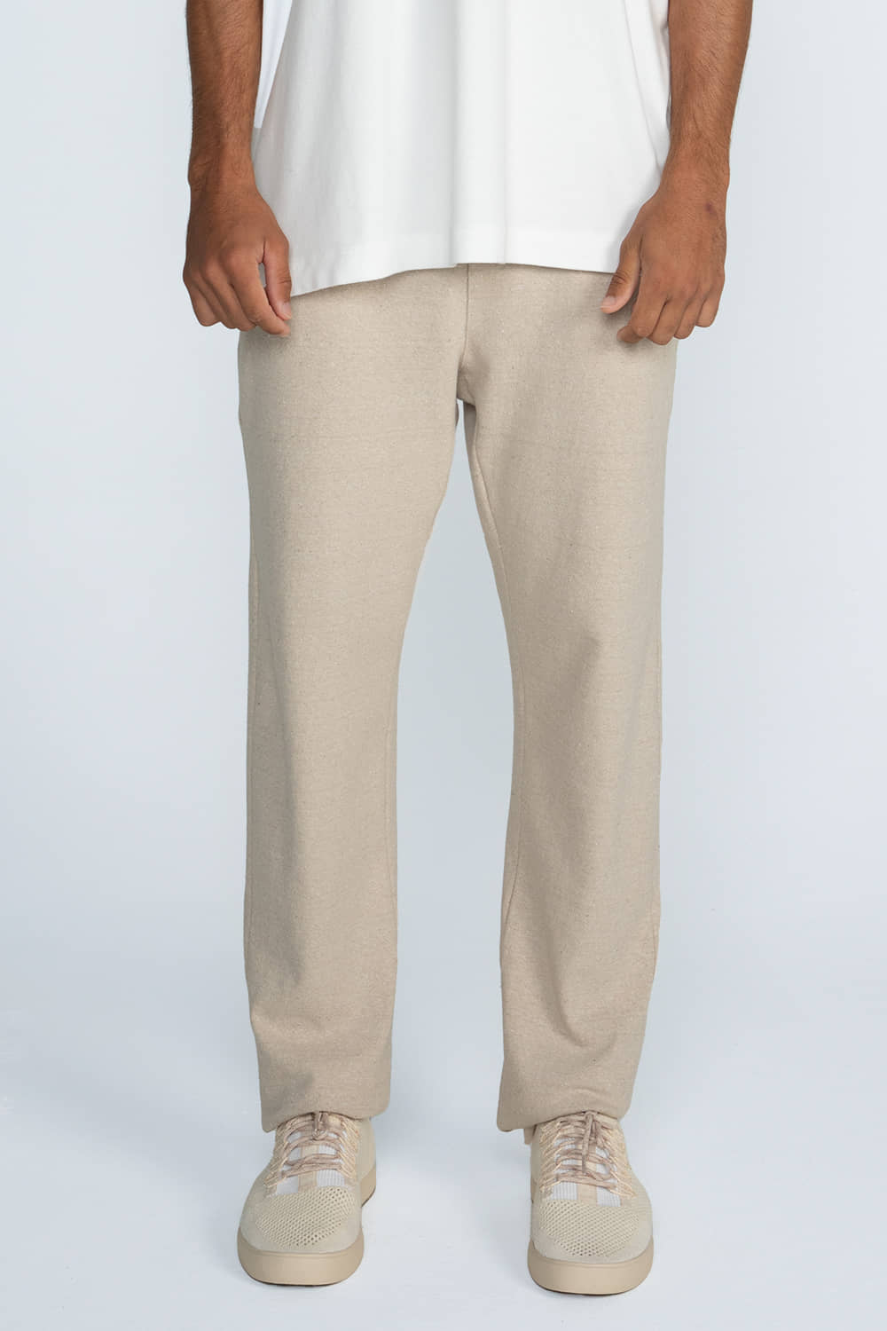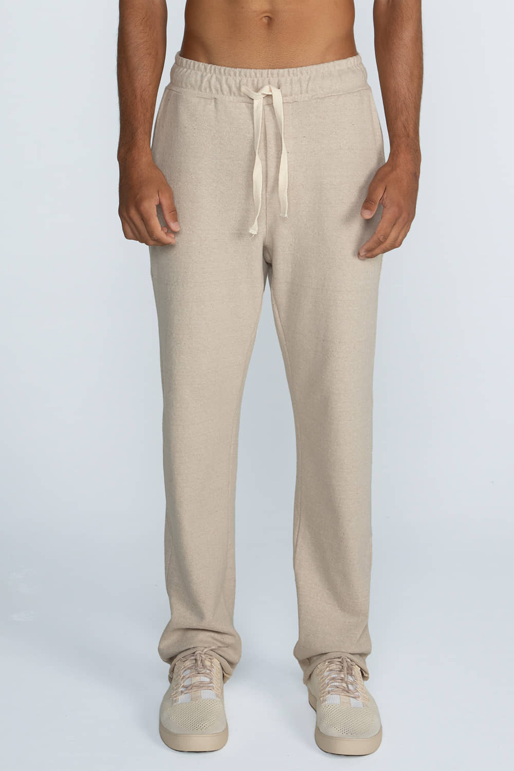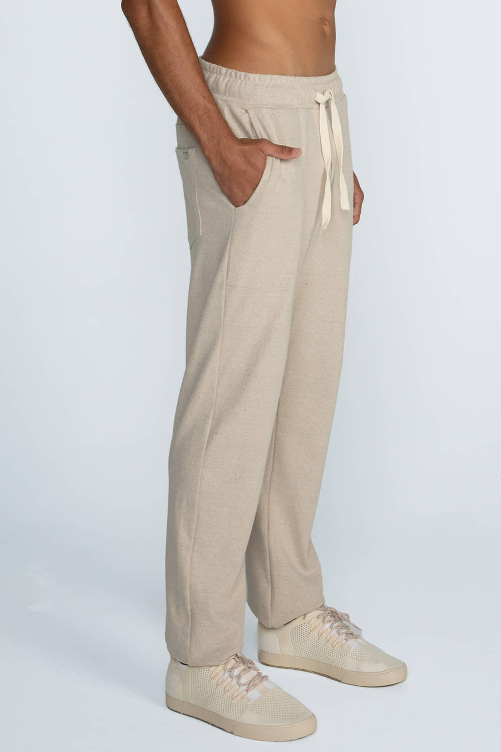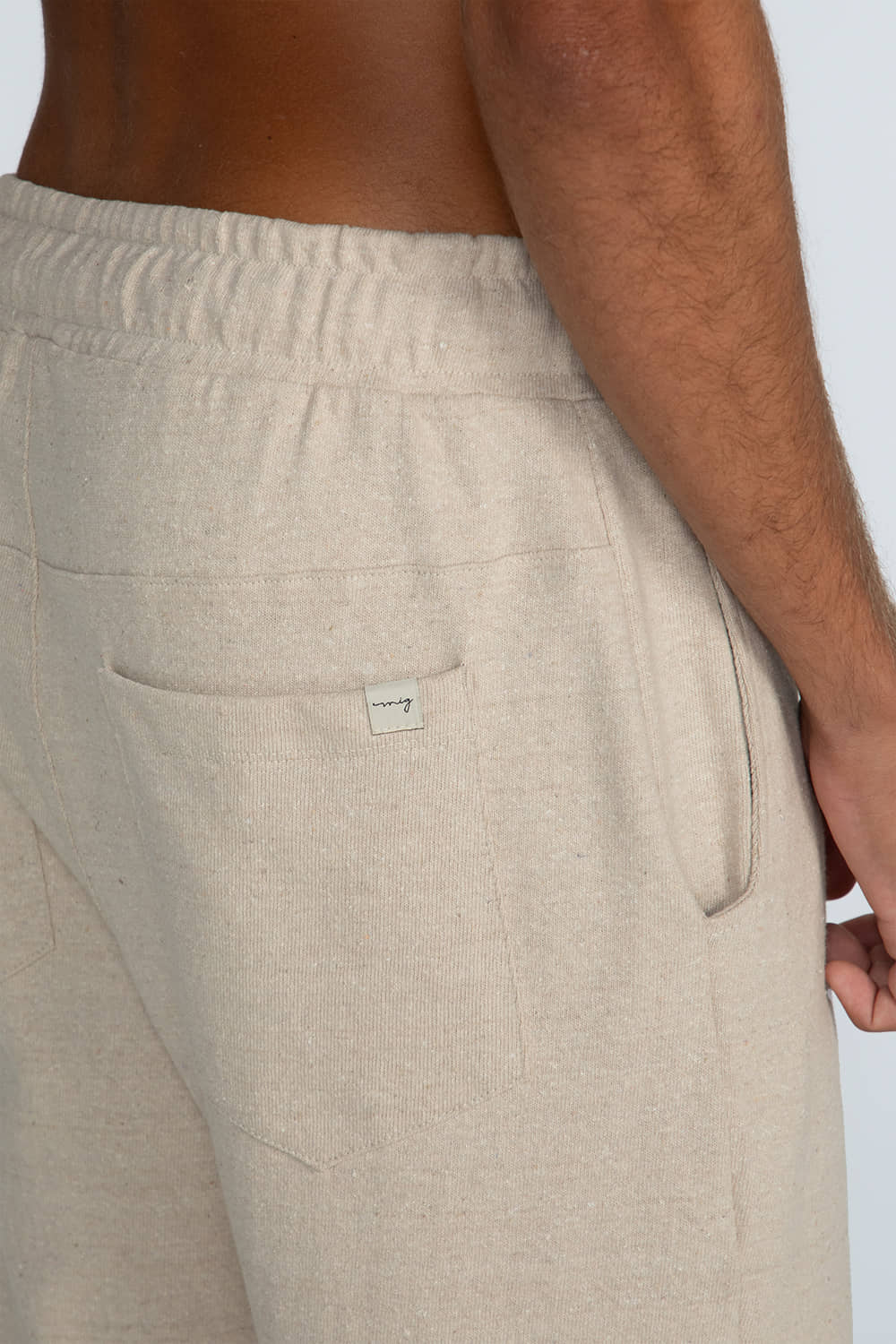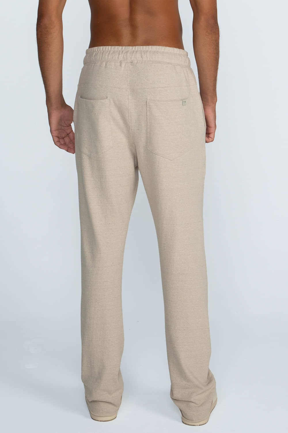 Calça com modelagem regular, cós com elástico e cadarço embutido para ajuste. Possui bolsos laterais e dois bolsos traseiros aplicados. A barra conta com acabamento em corte a fio.
