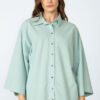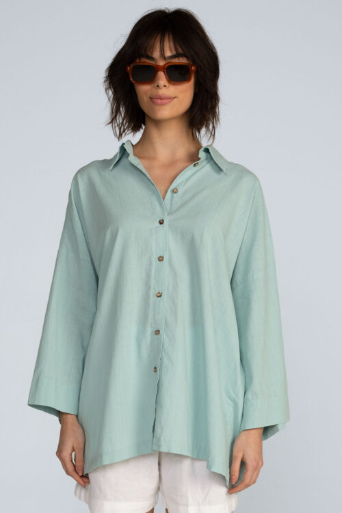 Modelagem: Ampla, comprimento alongado, cavas deslocadas, mangas ¾ com bainha larga, gola e colarinho, fechamento por botões de coco personalizados.