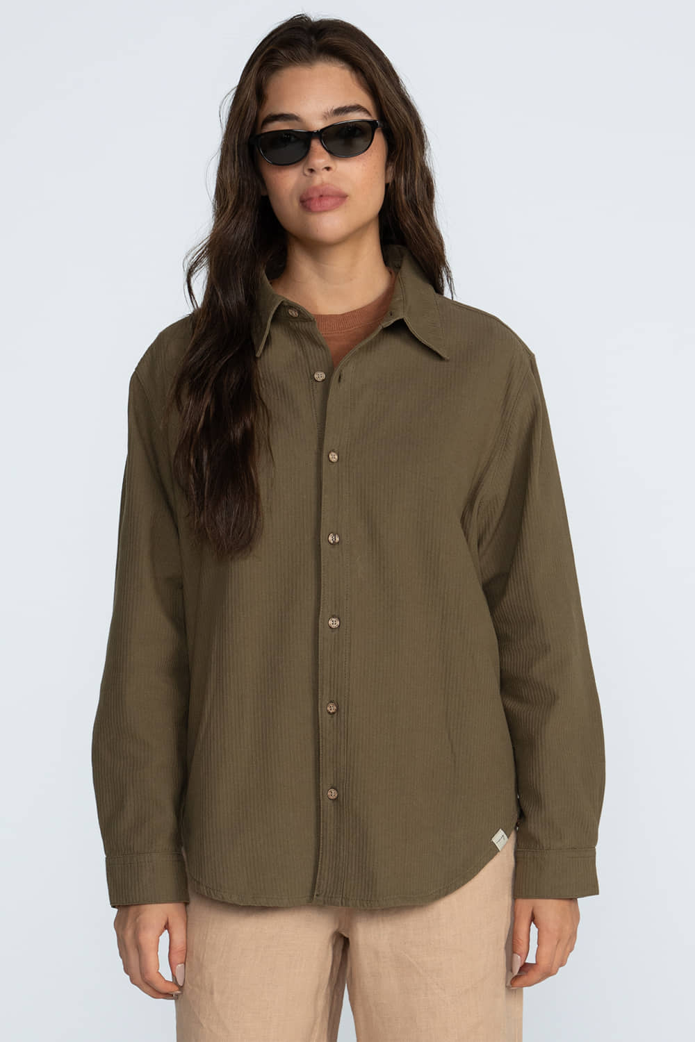 Camisa manga longa em sarja, com tecido mais encorpado e estruturado. Possui mangas com punhos e fechamento por botões de coco, gola com pé de gola, barra arredondada e fechamento frontal com botões de coco.