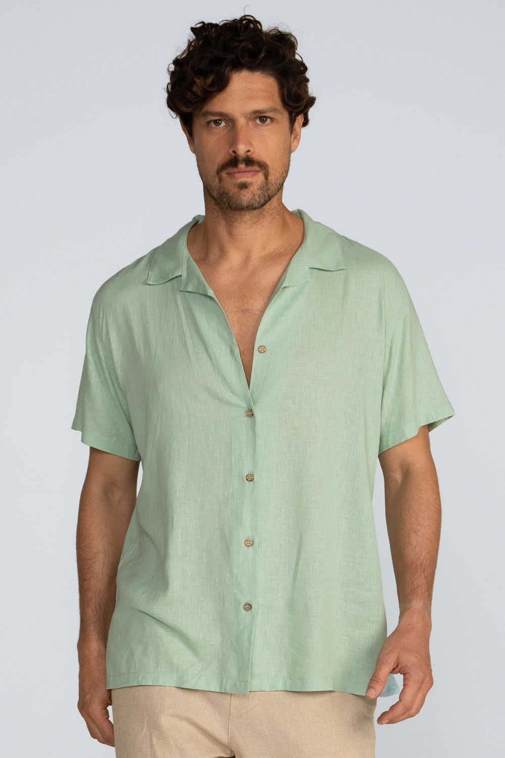 Detalhes: Mangas curtas, gola simples, pala traseira com prega central para melhor ajuste, fechamento frontal por botões de coco personalizados.