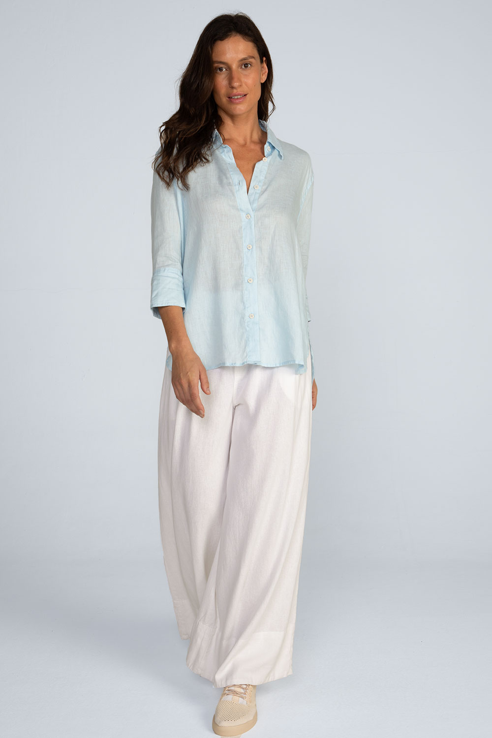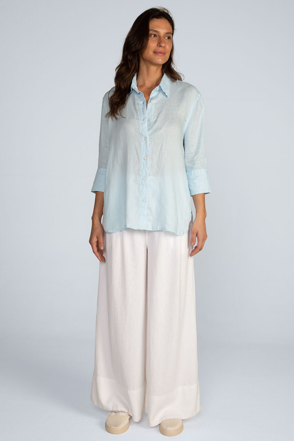 Modelagem: Reta e solta, barra arredondada, prega central nas costas, mangas ¾ com punho e botões, gola e colarinho, fechamento por botões sustentáveis.
