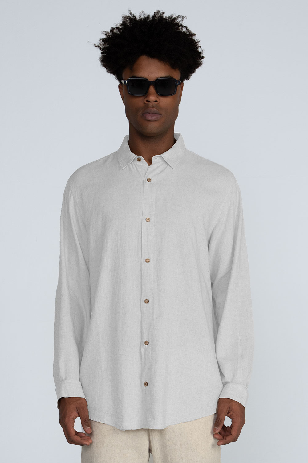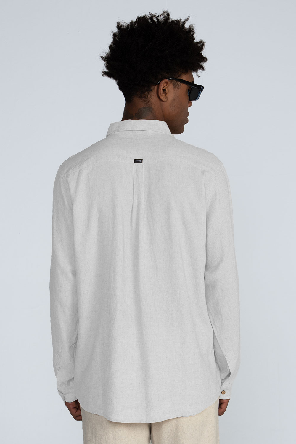 Detalhes: Gola colarinho, mangas longas com abotoamento nos punhos, pala traseira com prega central nas costas, fechamento frontal por botões de coco personalizados.