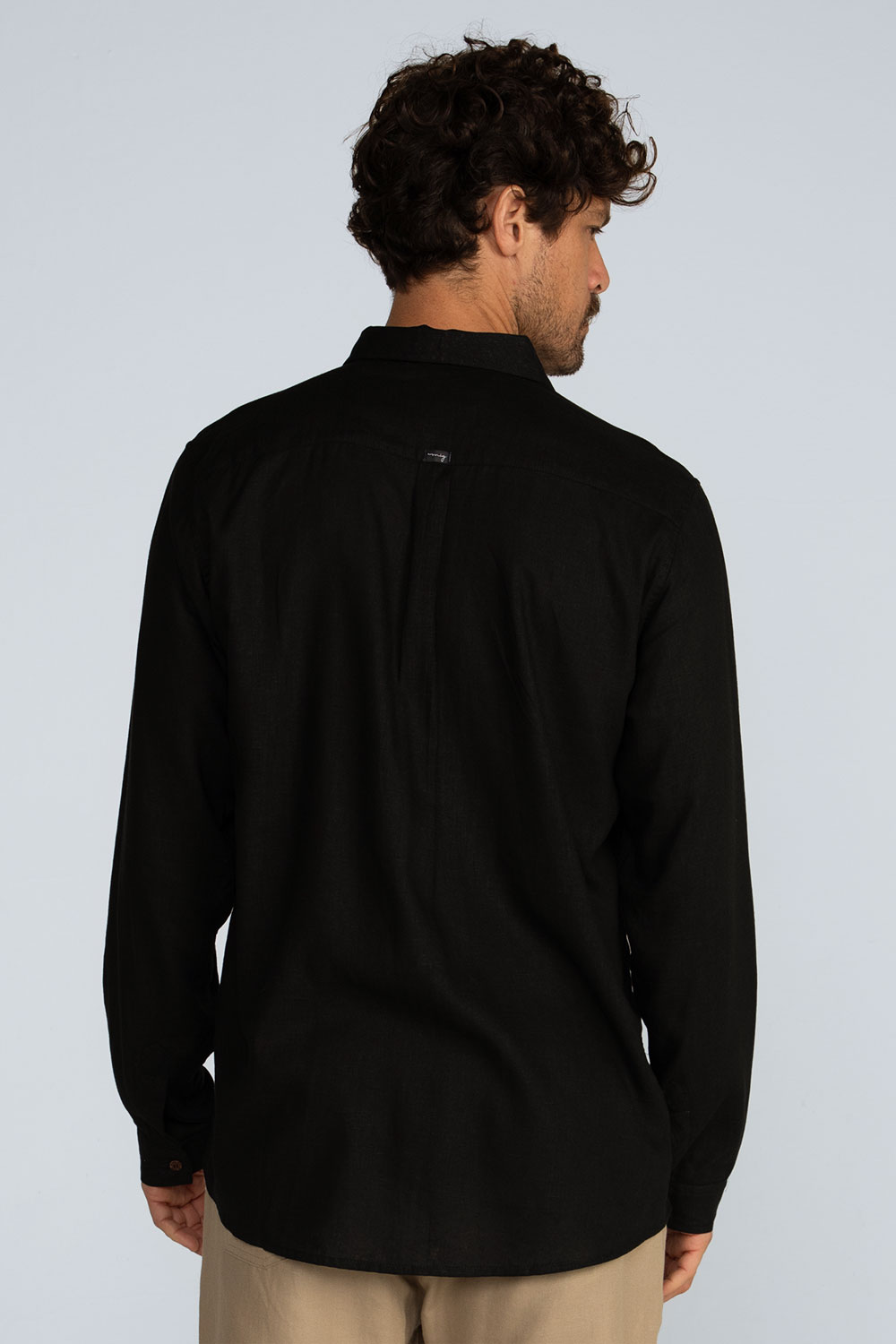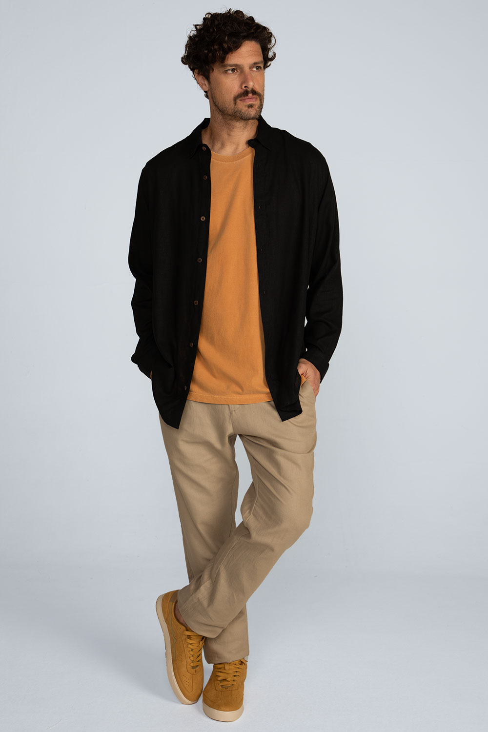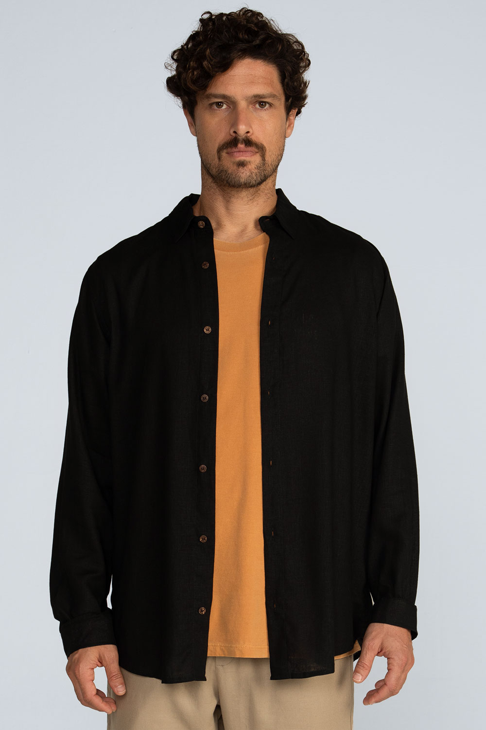 Detalhes: Gola colarinho, mangas longas com abotoamento nos punhos, pala traseira com prega central nas costas, fechamento frontal por botões de coco personalizados.