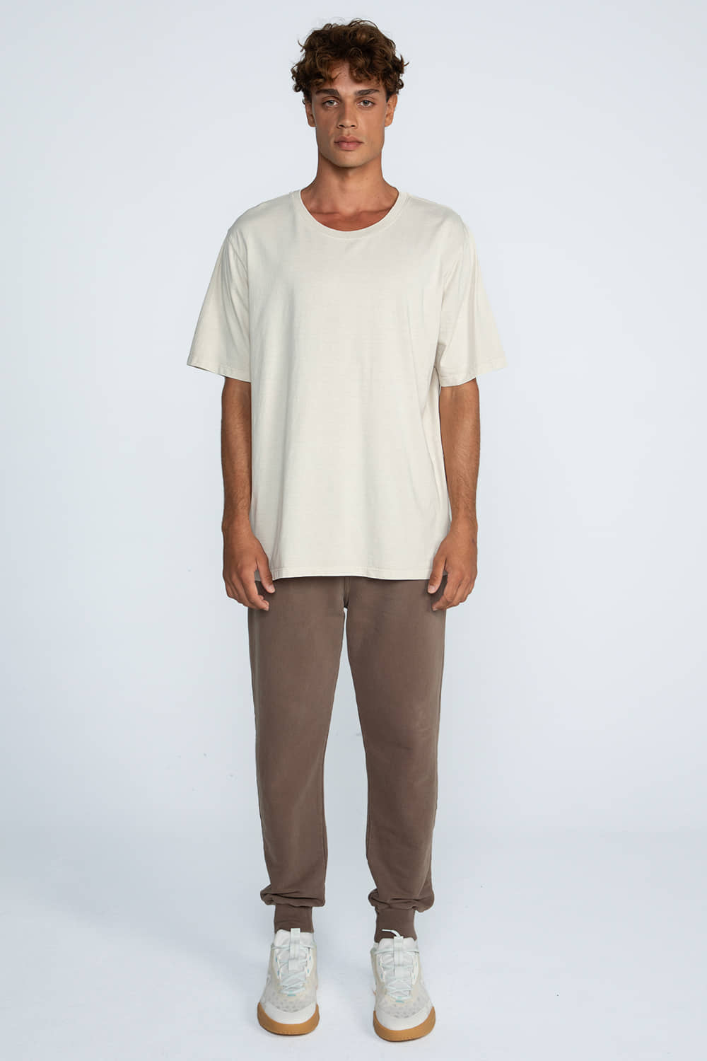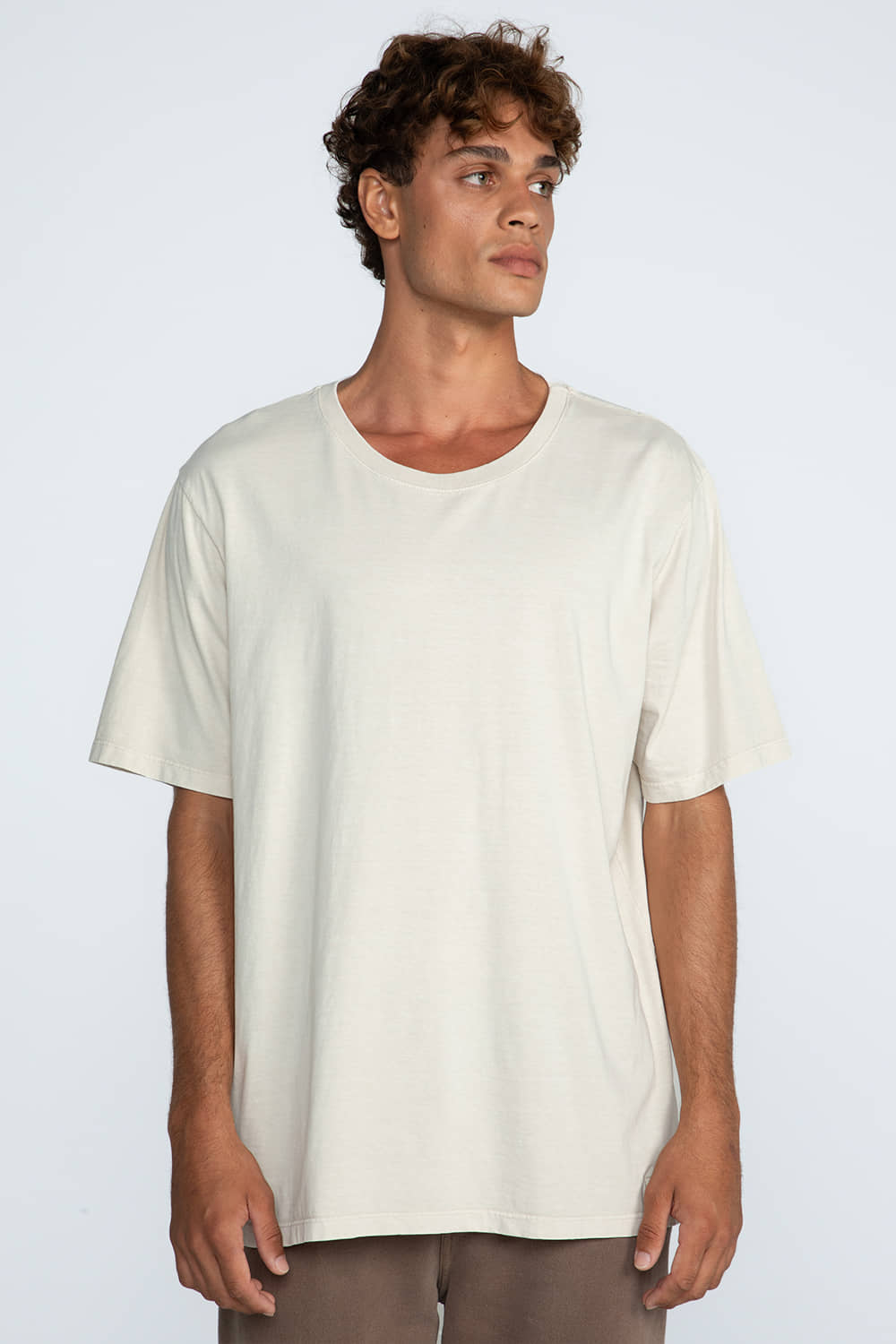 Camiseta confeccionada em meia malha fio 26, uma malha mais encorpada e pesada. Possui modelagem ampla, com ombros deslocados, proporcionando um visual moderno e estruturado. A peça apresenta tingimento estonado.