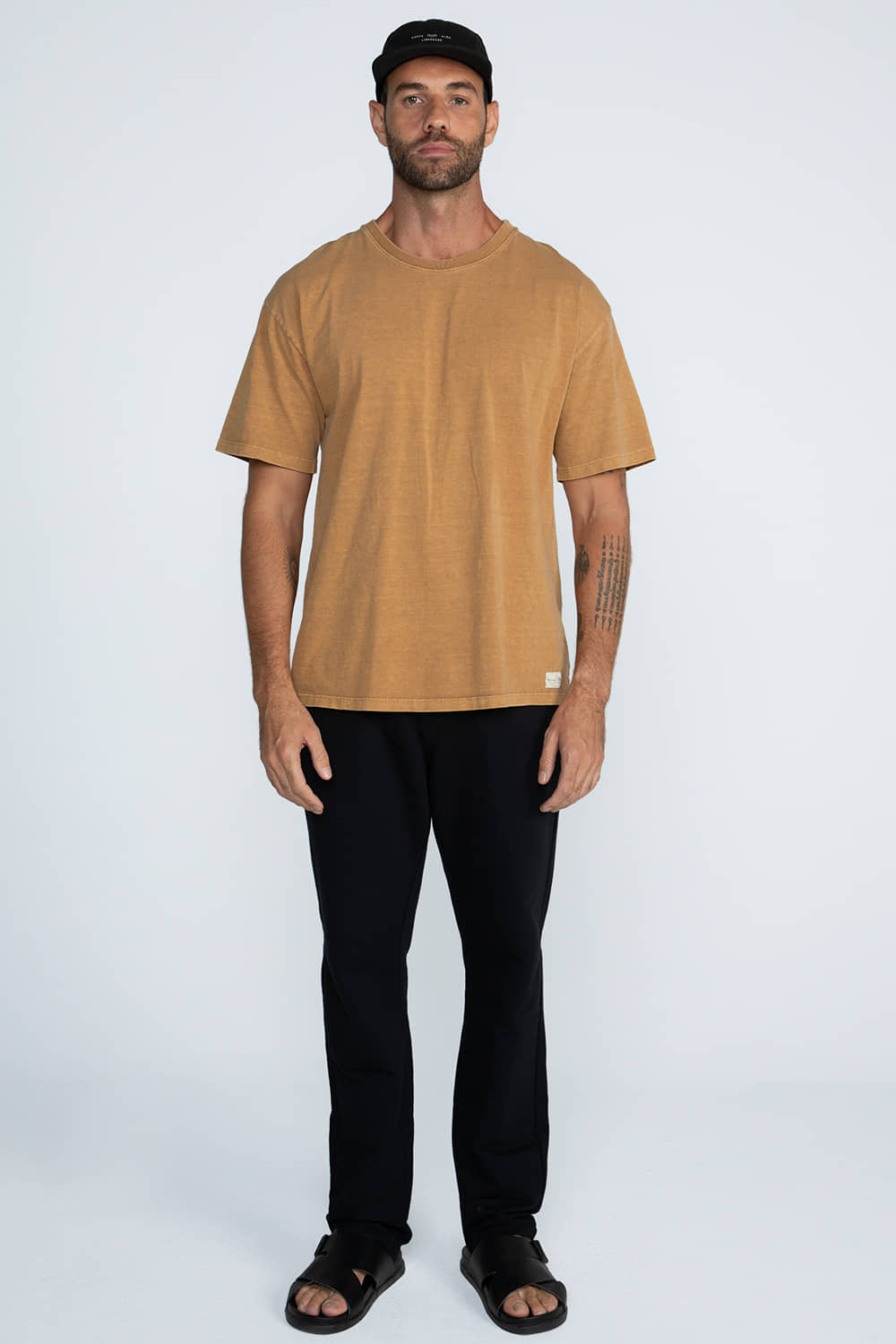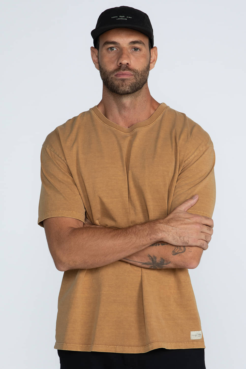Camiseta confeccionada em meia malha fio 26 ( mais grossa e mais pesada, se comparada a malha fio 30). Possui modelagem ampla, ombros largos e gola em ribana. A peça conta com tingimento estonado.