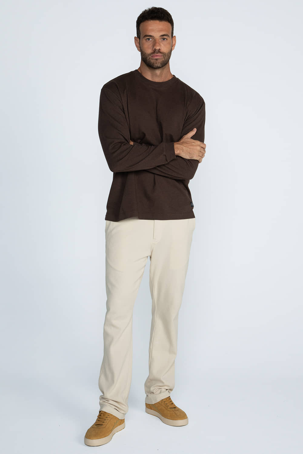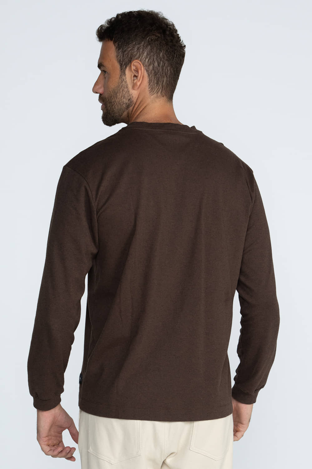 Camiseta manga longa com modelagem ampla e confortável. Possui etiqueta frontal, gola redonda com acabamento em ribana, punhos em ribana e barra com bainha. A peça apresenta toque macio e caimento leve.