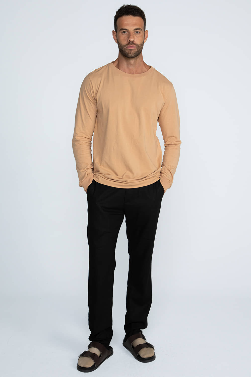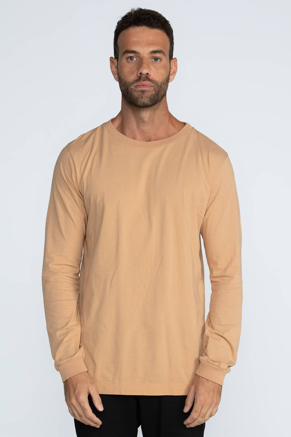 Camiseta manga longa em meia malha fio 30, com modelagem básica e confortável. Possui etiqueta frontal, gola redonda com acabamento em ribana, punhos e barra com acabamento em bainha. A peça apresenta tingimento estonado.