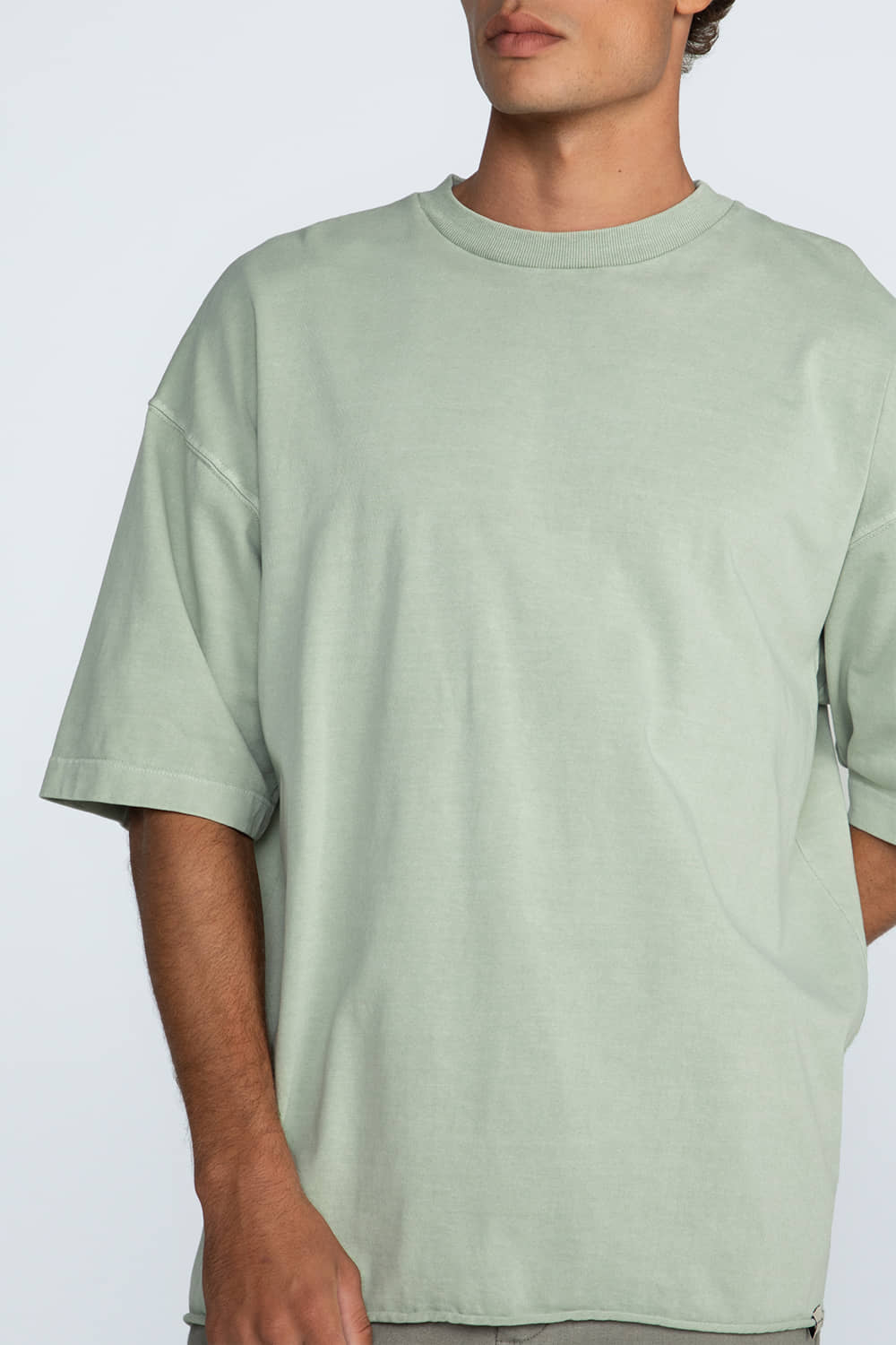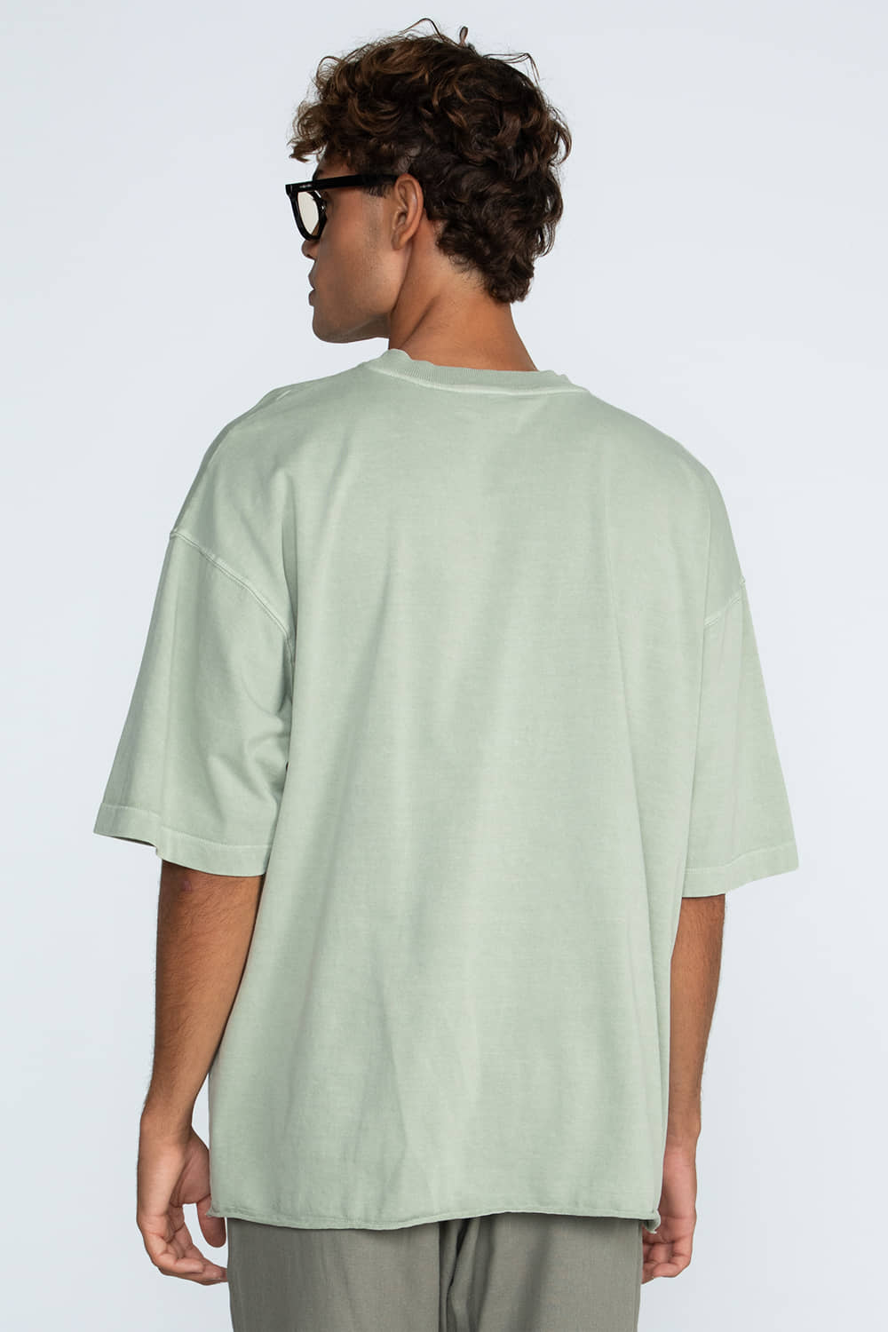 Camiseta confeccionada em moletinho, com modelagem ampla e ombros largos. Possui gola em ribana e tingimento estonado, garantindo conforto e estilo casual.