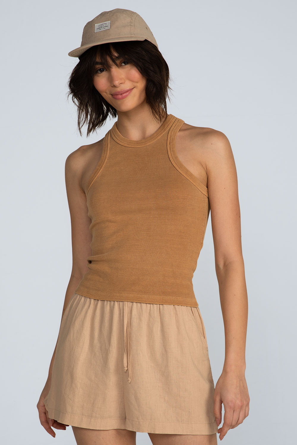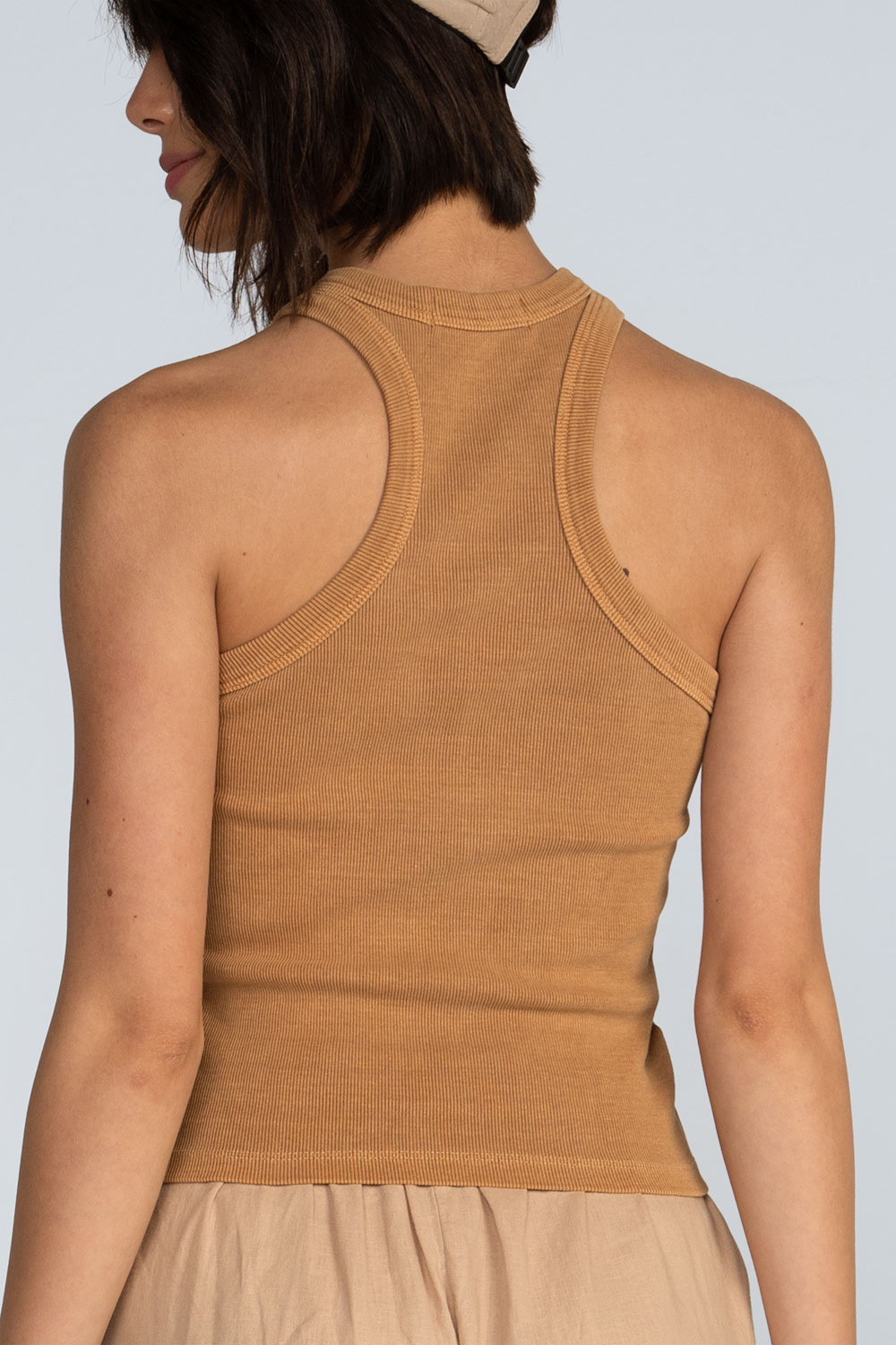 Detalhes: Decote frontal fechado, costas nadador, tingimento estonado.