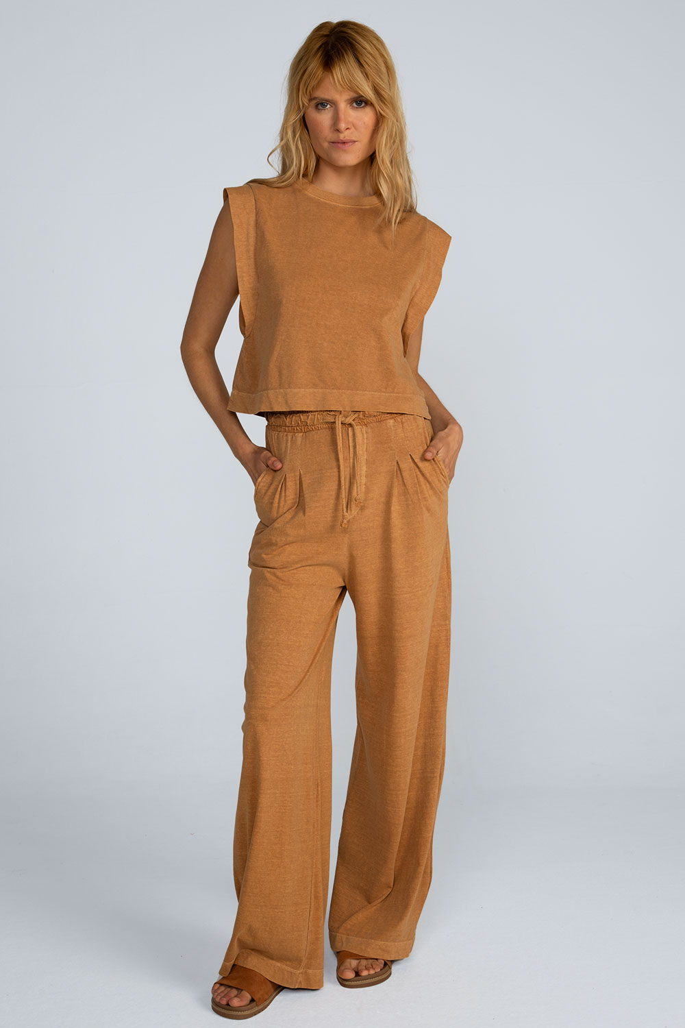Detalhes: Gola redonda em ribana, mangas japonesas, detalhe lateral que simula top, tingimento estonado.