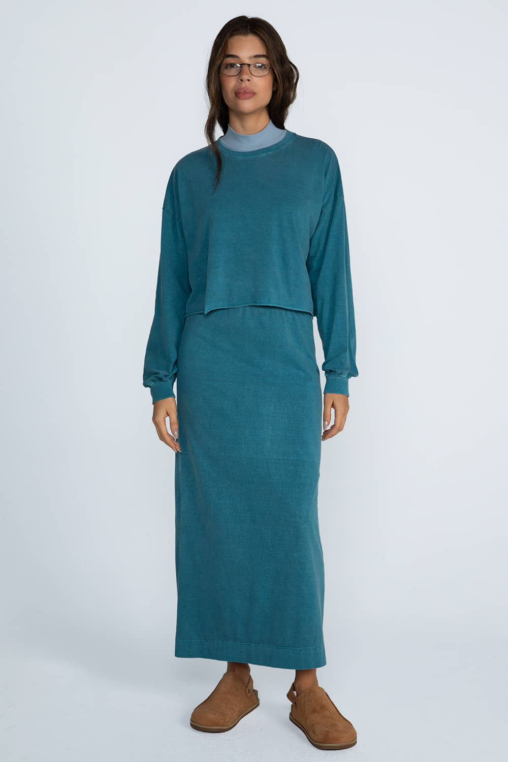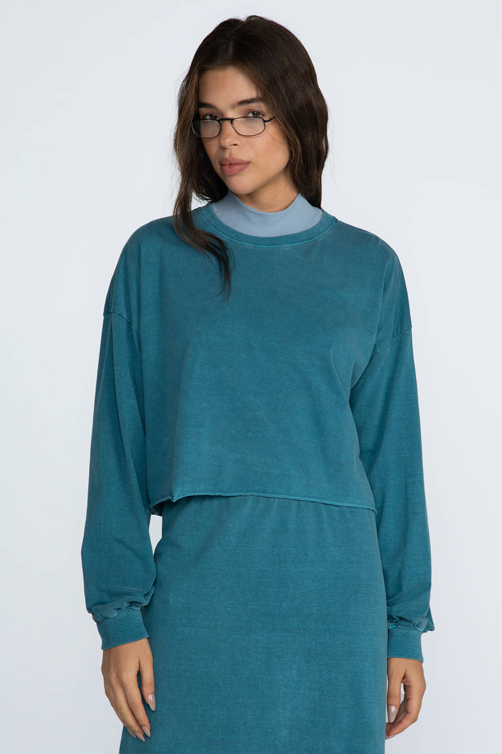Cropped em meia malha com modelagem mais curta e solta. Possui mangas longas com acabamento em ribana nos punhos, gola redonda com ribana e barra com acabamento em corte a fio. A peça conta com tingimento estonado, que traz personalidade ao visual.
