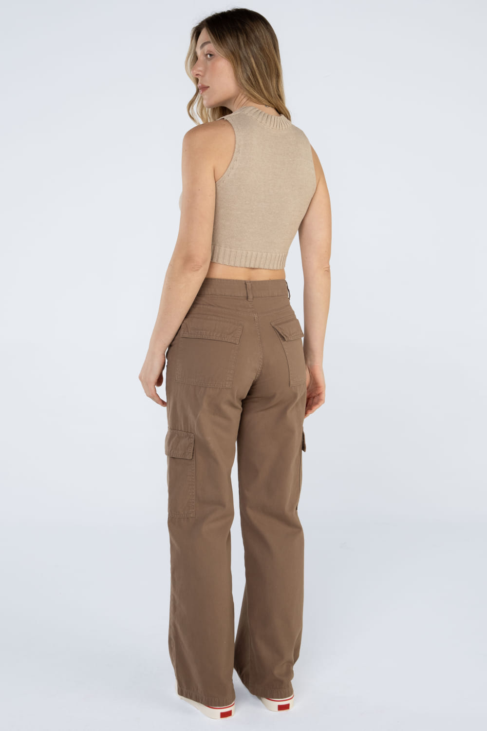 Detalhes: Cropped em malha retilínea (tricô), modelo regata, com decote redondo e a gola mais fechada.