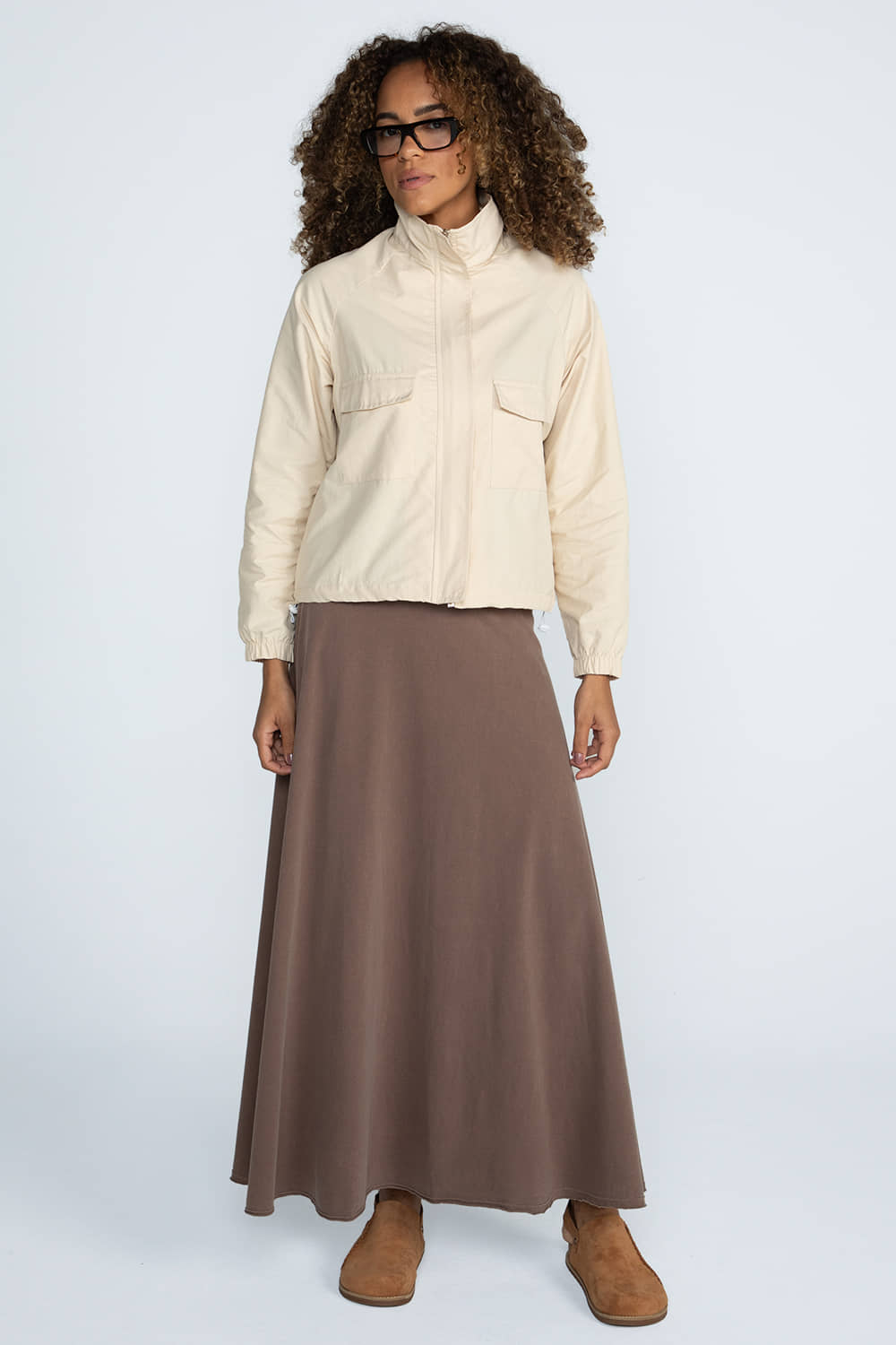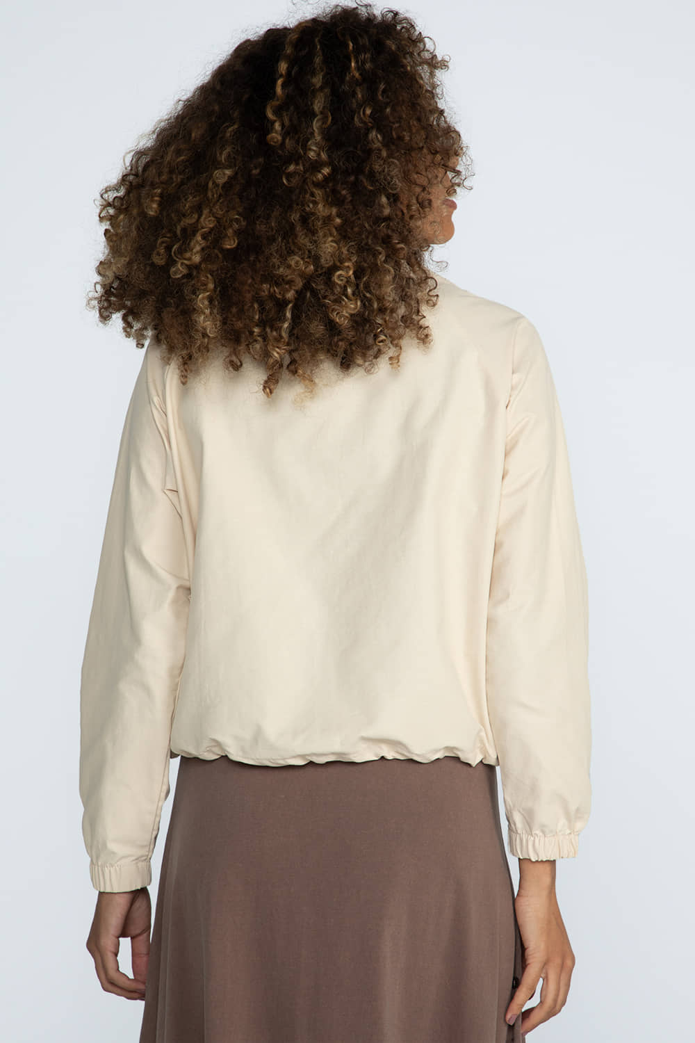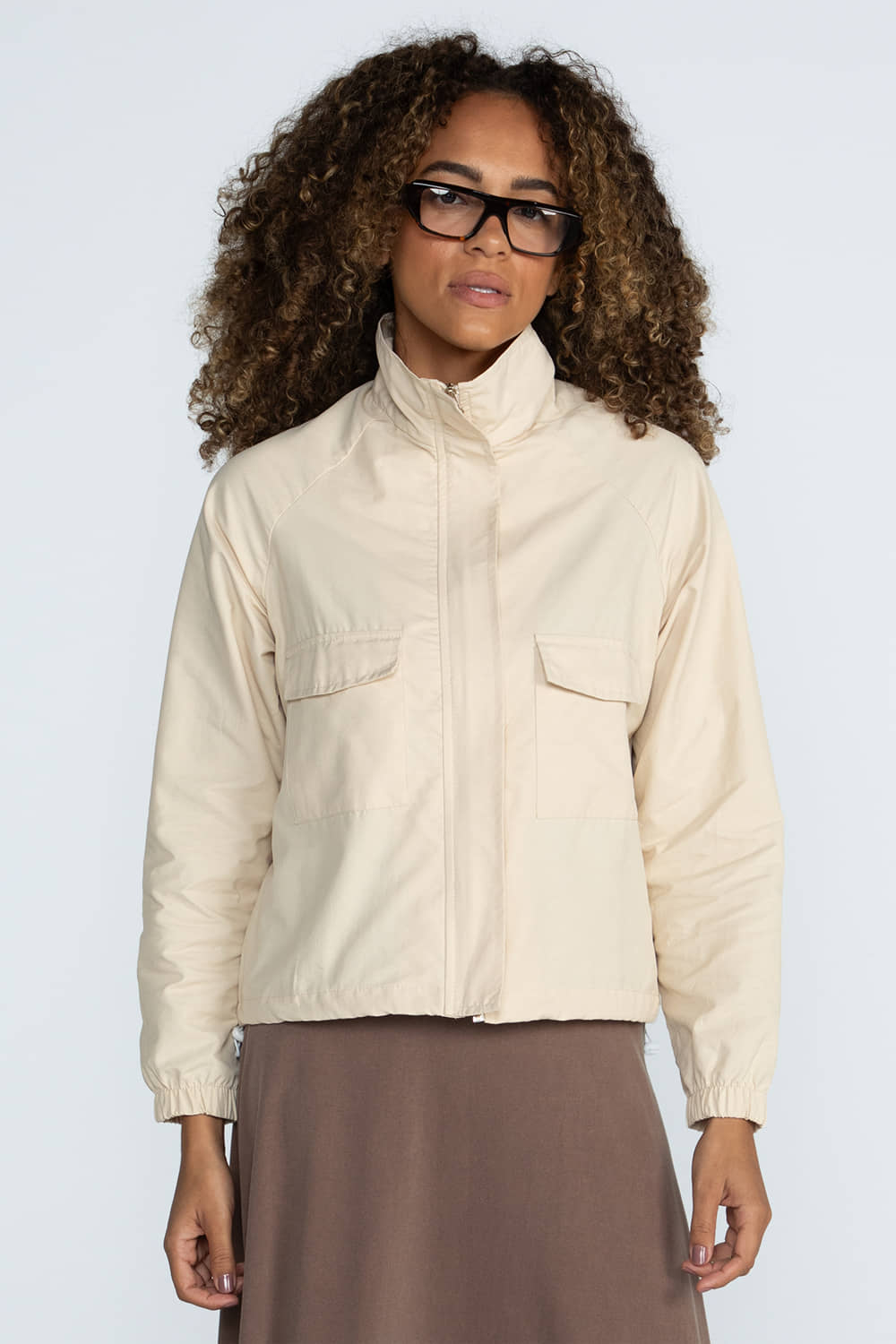 Jaqueta com modelagem reta e comprimento mais curto. Possui cavas raglã, bolsos frontais com lapela, punhos com elástico, fechamento por zíper e gola alta. Conta com bainha com elástico embutido e regulador.