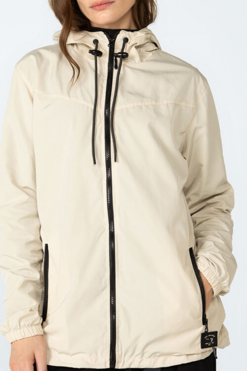 Modelagem: Curta, com recorte em “V”, capuz ajustável, bolsos frontais com zíper, bainha com regulador interno, punhos elásticos e fechamento por zíper tratorado