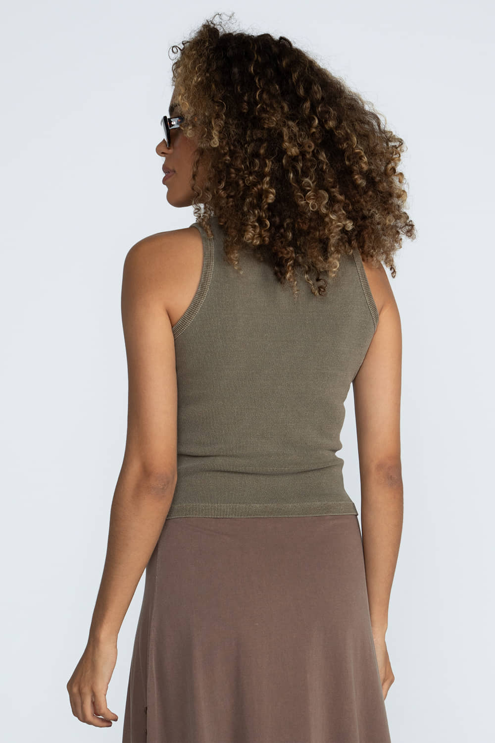 Regata feminina com modelagem básica e ajustada ao corpo. A peça apresenta tingimento estonado, trazendo um visual moderno e casual.