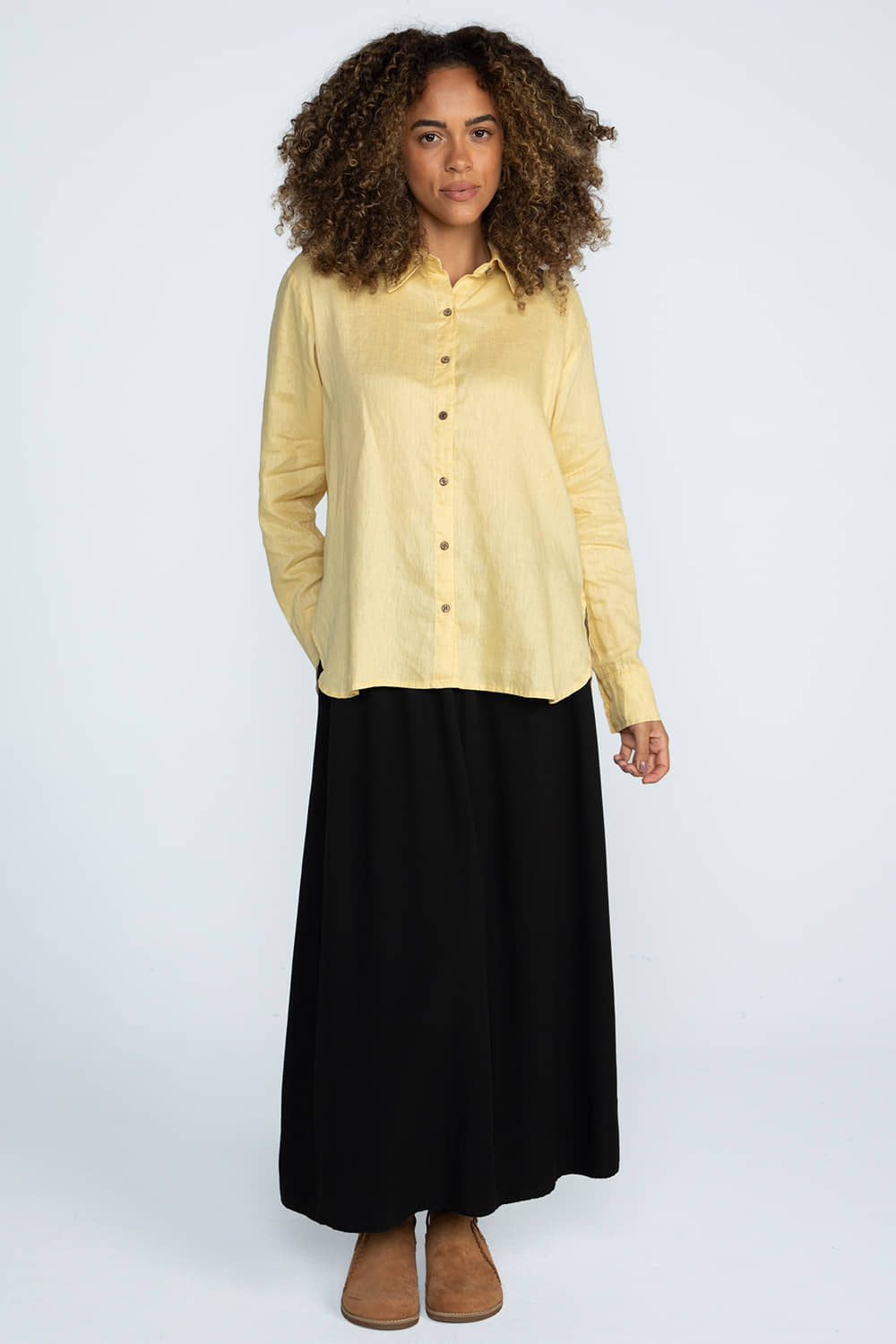 Saia midi modelo evasê, com movimento leve e caimento fluido que valoriza a silhueta. O tecido leve garante conforto e elegância em qualquer ocasião.