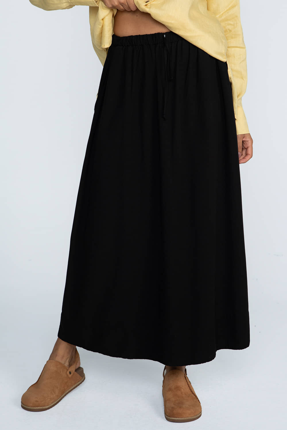 Saia midi com modelagem evasê e volume. Possui cós com elástico e cadarço para ajuste, garantindo conforto e praticidade.