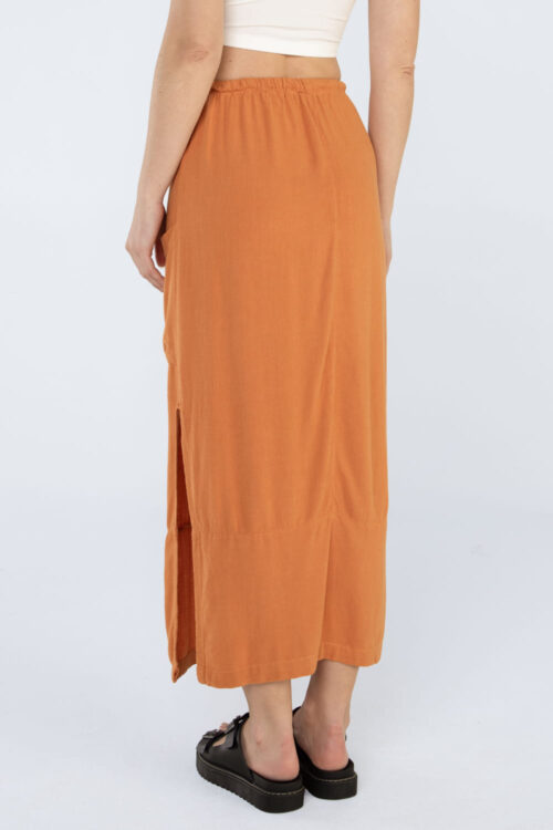 Detalhes: Saia midi em linho estonado, com modelagem reta, bolso amplo aplicado na lateral frontal esquerda. A peça apresenta recortes verticais e horizontais na parte frontal. O cós possui elástico com cadarço embutido para ajuste. Fenda na lateral esquerda.