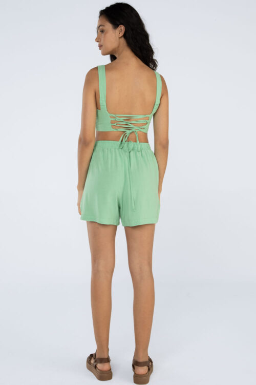 Detalhes: Shorts de viscose, com modelagem cintura alta, mais comprido, com barra levemente arredondada, possui cós de elástico, bolsos faca.