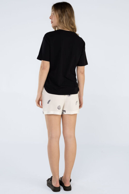 Detalhes: Shorts em viscose estampada, com modelagem mais curta, cós de elástico com cadarço para amarração e ajuste. Apresenta bolsos faca frontais e um bolso aplicado na parte traseira.