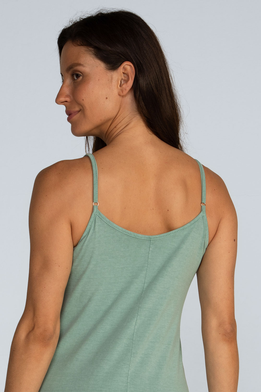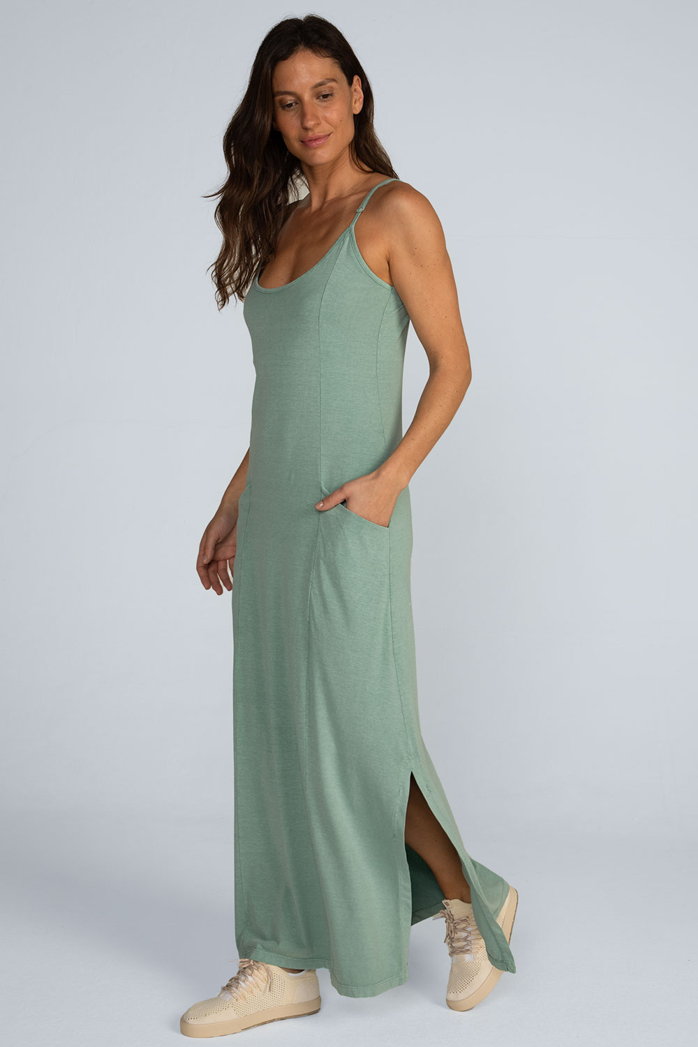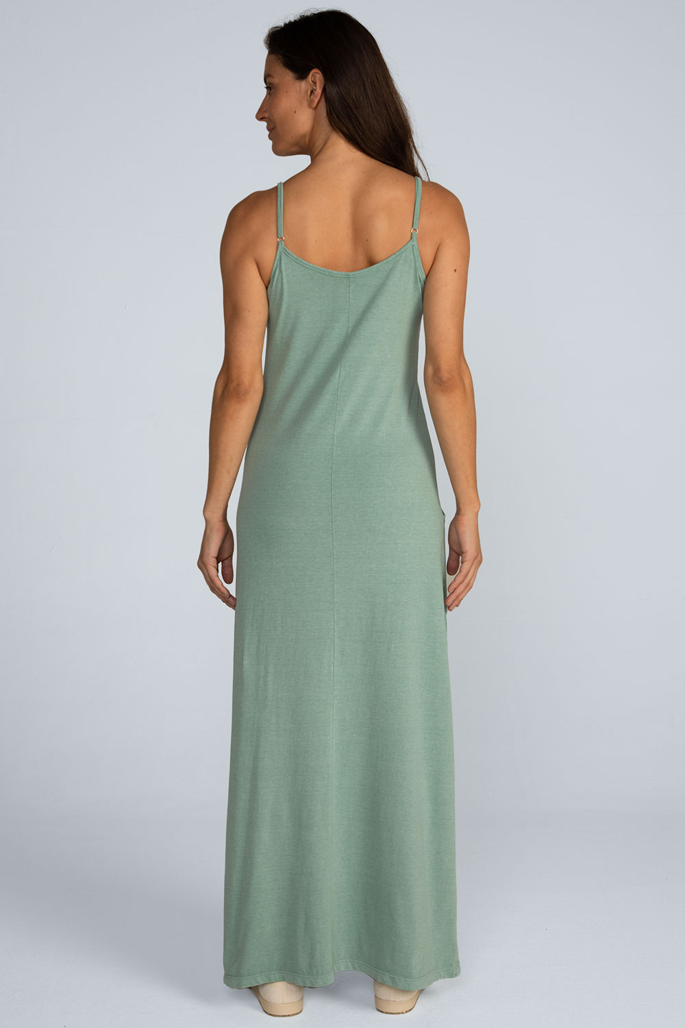 Vestido longo feito em meia malha fio 30, com caimento leve e confortável. Possui alças finas reguláveis para ajuste personalizado e bolsos frontais deslocados, que unem praticidade e estilo. O tingimento estonado confere à peça um acabamento autêntico e único.