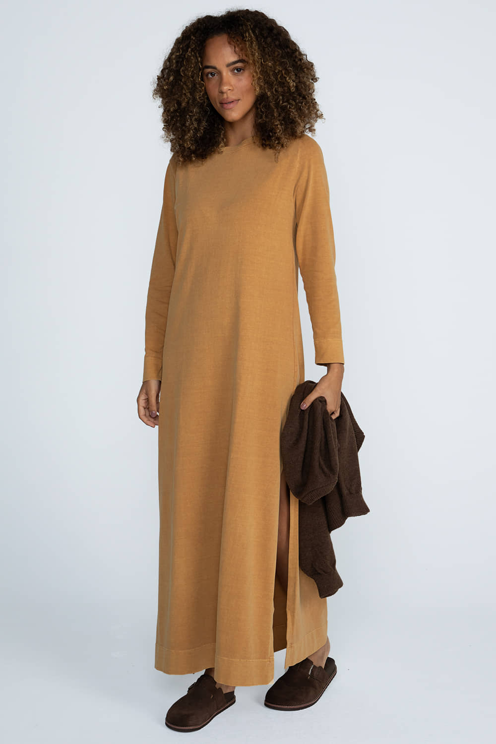 Vestido longo em malhão, com toque macio e caimento fluido. A modelagem reta levemente evasê com fendas laterais traz movimento e leveza, enquanto o acabamento estonado garante um visual moderno e despojado.