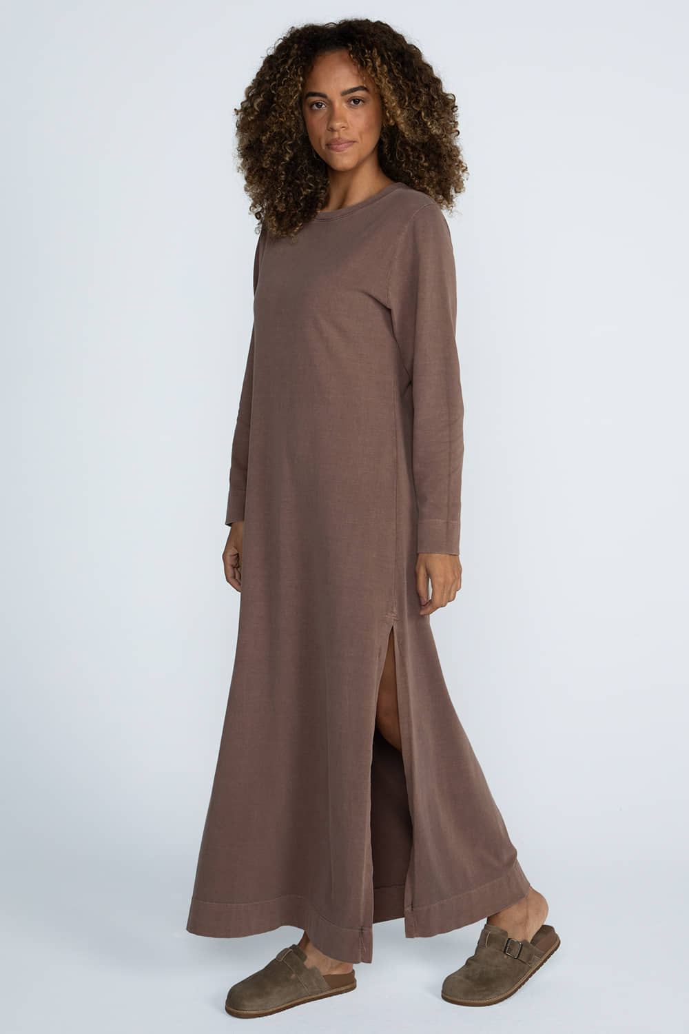 Vestido longo de manga longa confeccionado em malhão, com modelagem reta levemente evasê que valoriza o caimento. Possui gola redonda em ribana para maior conforto, além de fendas laterais que proporcionam mobilidade e fluidez ao caminhar. A peça conta com lavagem estonada, conferindo um visual atual e cheio de personalidade.